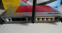 Sul retro troviamo le tre antenne che caratterizzano la connessione Wi-Fi con standard “N”, una porta di colore grigio chiaro in cui andremo ad inserire il cavo ad Y che abbiamo trovato nella confezione che collegherà il nostro Fritz! alla linea telefonica. Subito a fianco ci sono due porte che utilizzeremo per collegare due telefoni tradizionali (che siano fissi o cordless), quindi una porta per collegare un centralino ISDN e una porta USB 2.0 che ci permetterà di condividere HardDisk USB o Stampanti con la rete locale. Da precisare che a questa porta USB possiamo collegare anche un HUB USB, che ci permetterà di condividere simultaneamente più dispositivi. Ecco quindi 4 porte di colore Giallo che consentono il collegamento di 4 computer via LAN ed infine il connettore per l’alimentazione.